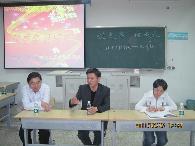 5月25日晚7点30分,机电工程学院政研社组织了以“谈更名,话成长”为主题的座谈会。本次活动特别邀请了校党委宣传部方桐清部长,机电工程学院党总支朱铁壁副书记为151amjs澳金沙门政研社全体成员做了一场生动的演讲交流。会议由政研社指导老师于馥颖主持。