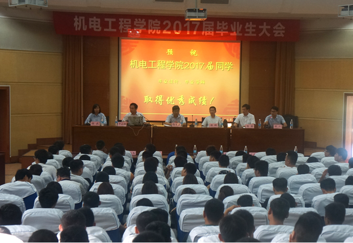 为确保2017届毕业生答辩及离校工作顺利进行,2017年5月24日下午四点半,机电工程学院在学术报告厅隆重召开2017届毕业生大会。机电工程学院党总支潘峰书记、机电工程学院仇文宁院长、机电工程学院李志球副院长、机电工程学院党总支鹿毅副书记、机电工程学院赵武副院长五位领导出席了大会,参加会议的还有机电学院专业主任、全体专兼职辅导员和2017届全体毕业生,会议由办公室主任胡兵主持。