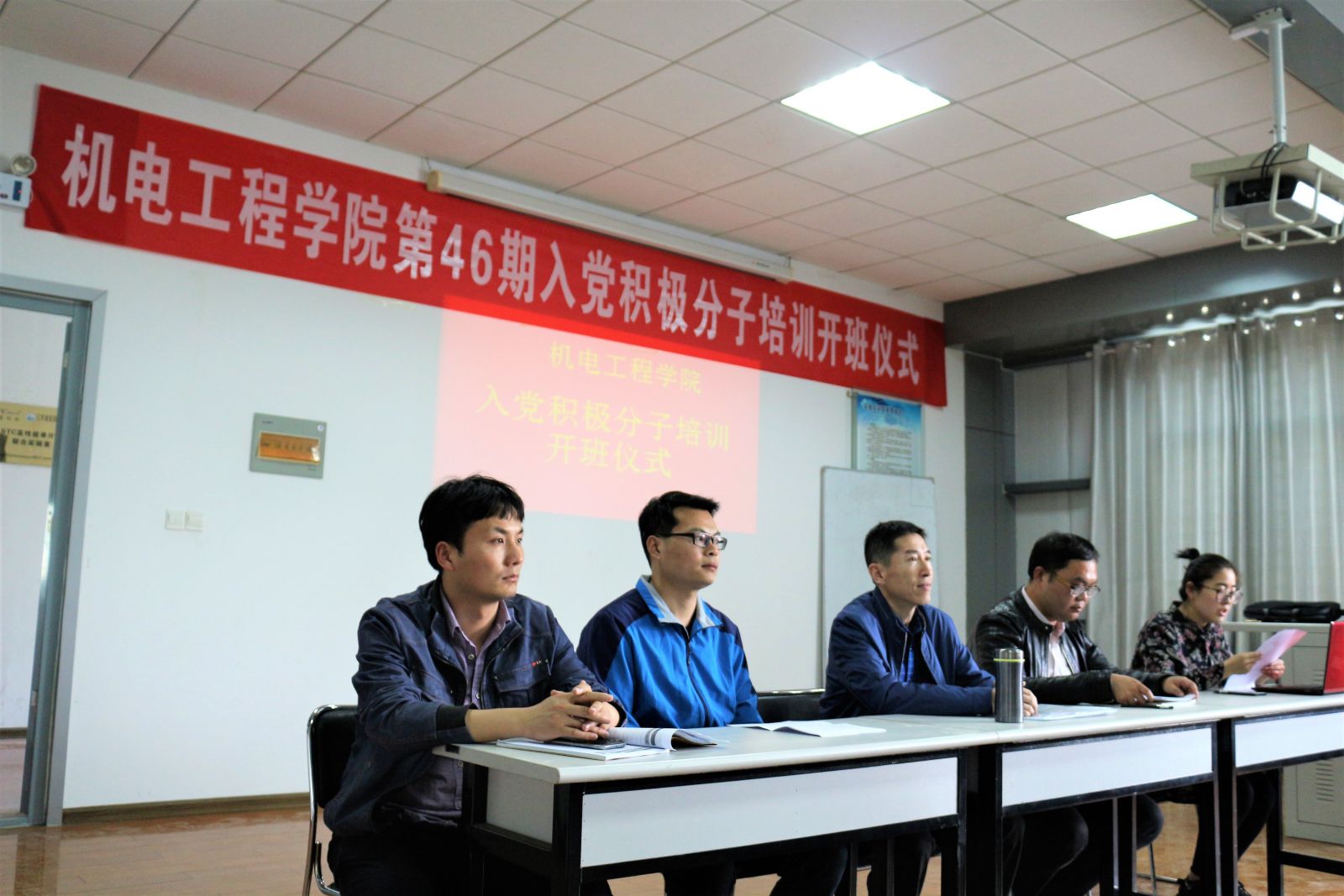 2018年4月2日下午,机电工程学院第46期党校培训班开班仪式在机电工业中心举行。学院党总支书记、分党校校长潘峰老师作专题讲座,党总支副书记李珂老师、培训班导师胡兵老师、鹿鹏程老师、郭利老师出席开班仪式。培训班采取了专题讲座、自学讨论、观看视频、实践活动等多种授课形式,共有51名同学参加。