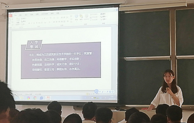 汪满莎老师以大学生校规校纪及违纪处理为切入点,以“无规矩,不方圆”“不学礼,无以立”“放眼量,看今朝”三个方面为主线,通过引发学生思考在新的起点,该如何利用大学的三年时光,从而对学校的规章制度、安全教育、文明礼仪规范等进行了较为深入的解读。最后,在汪满莎老师的感染下,所有同学自发齐声朗读了入学誓词,同时老师也对他们表达了殷切的希望。希望学生们在崭新的人生阶段,能顺境不骄,逆境不馁,青春灿烂,成为这世界上最亮的光。