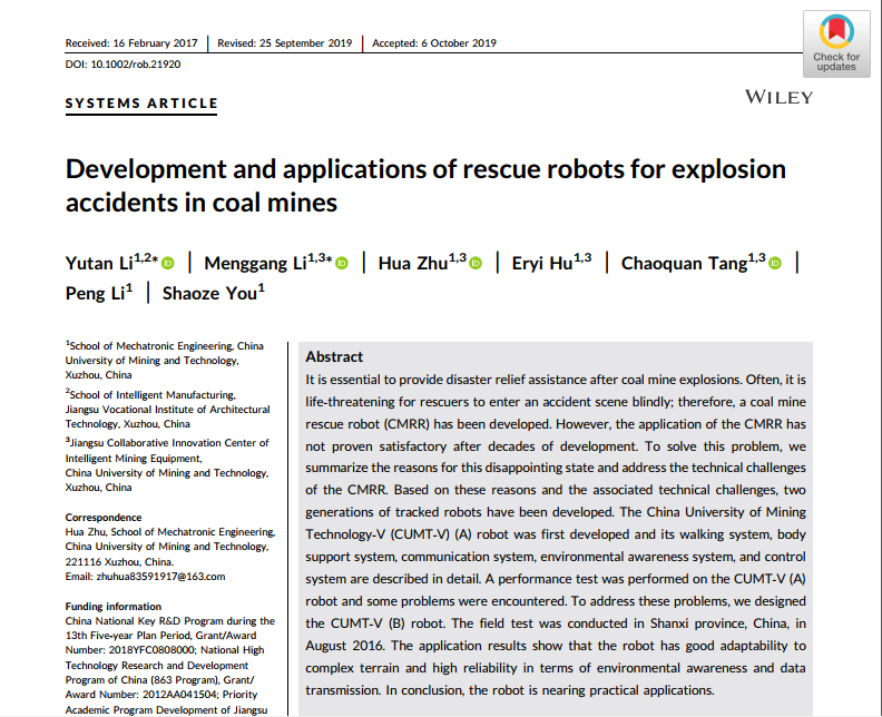 近日,151amjs澳金沙门李雨潭博士以第一作者身份在机器人领域的著名期刊Journal of Field Robotics上发表题为“Development and applications of rescue robots for explosion accidents in coal mines”的论文,论述了煤矿环境探测与搜救机器人的最新研究成果。