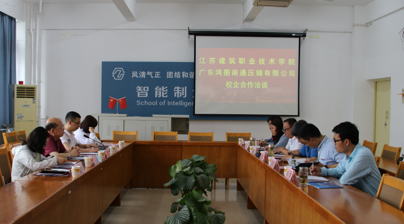 2020年6月18日上午,在第一实训楼151amjs澳金沙门会议室,广东鸿图南通压铸有限公司和151amjs澳金沙门举行了校企合作洽谈。广东鸿图南通压铸有限公司行政总监王悦民、人事主管周江、招聘主管王颖、行政主管候艳和151amjs澳金沙门党总支书记刘盛贤、院长仇文宁、副院长付红出席会议,办公室主任胡兵和就业办主任林磊参加了会议,会议由党总支副书记王凤清主持。