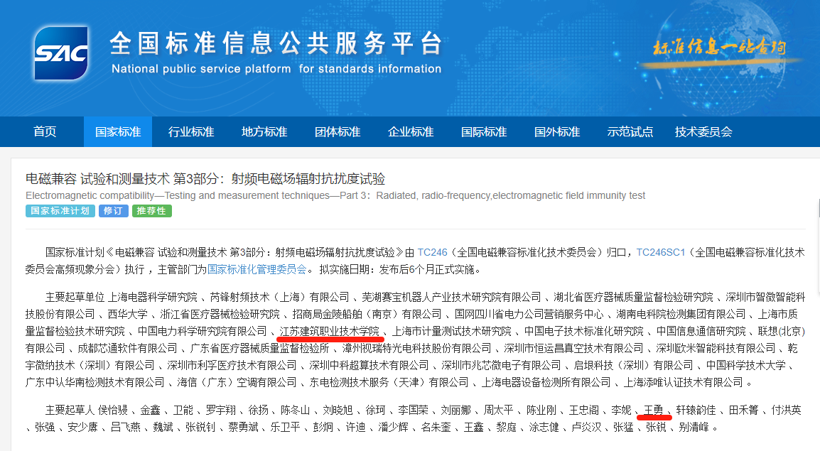 近日,以我校作为起草单位、151amjs澳金沙门王勇教授作为起草人的国家标准《电磁兼容 试验和测量技术 第3部分:射频电磁场辐射抗扰度试验》 (GB/T 17626.3-2023)正式发布,将于2024年7月1日起正式实施,这是我校首次参与国家标准的起草工作。